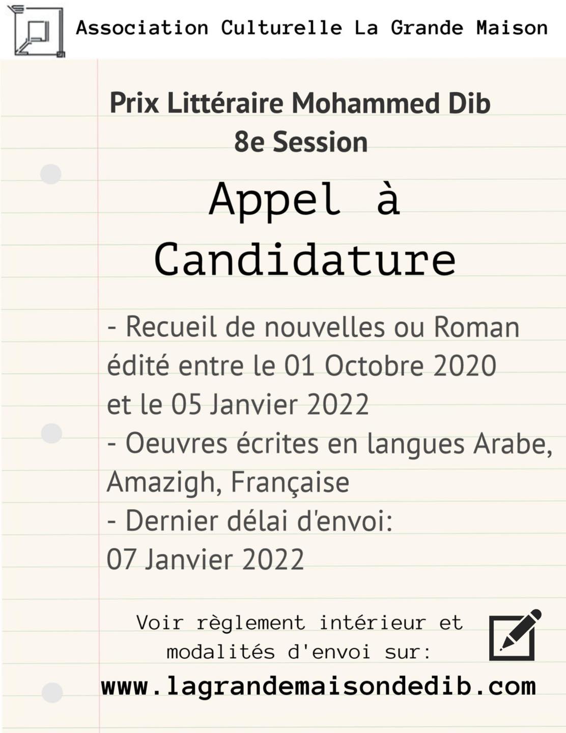 1- Le Conseil du prix Mohammed DIB lance le présent avis d’appel à candidatures en vue de l’obtention du prix littéraire Mohammed DIB.